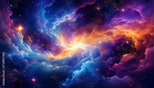 a breathtaking cosmic vista showcases a glowing nebula with vibrant hues of blue purple and gold distant stars twinkle amidst swirling gas creating a mesmerizing celestial dance