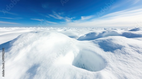 A breathtaking expanse of snow-covered hills stretches endlessly under a bright blue sky
