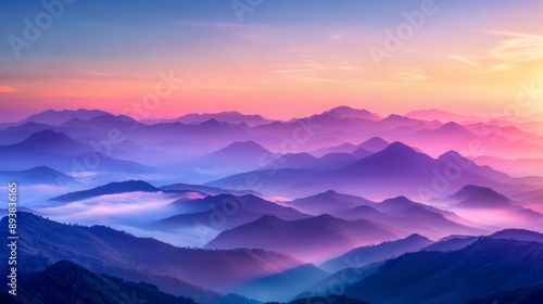 A breathtaking landscape showcasing a misty mountain range illuminated by a vibrant purple and pink sunset