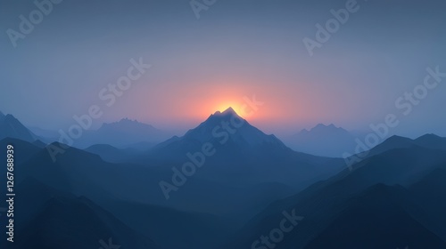 A breathtaking mountain landscape at sunrise, with soft hues illuminating peaks amidst layered hills, Ideal for travel, nature themes, relaxation, or inspiring graphic designs,