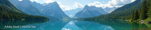 A breathtaking panoramic view of a pristine mountain range, lush forests, and a crystal-clear lake reflecting the sky Perfect for adventure, travel, and nature themes , untouched, conservation, calm