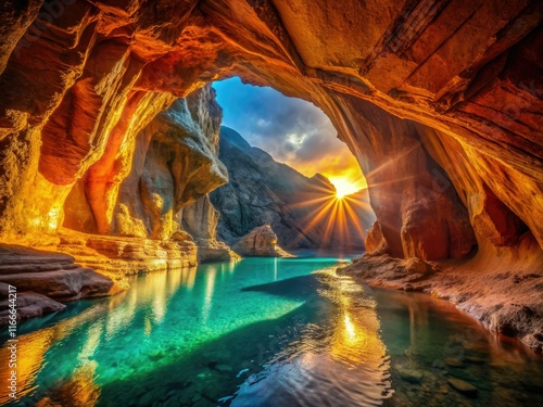cave, turquoise, orange, colourful, rock formation, nature, sunlight, shadow, hi-res, photorealistic, adventure, landscape, scenery, travel, destination, beautiful, stunning, amazing, breathtaking, picturesque, texture, underground, subterranean, hidden, mystery, exploration, discovery, wonder, natural beauty, earth, rock, stone, cavern, cave, spelunking, interior, exterior, light
