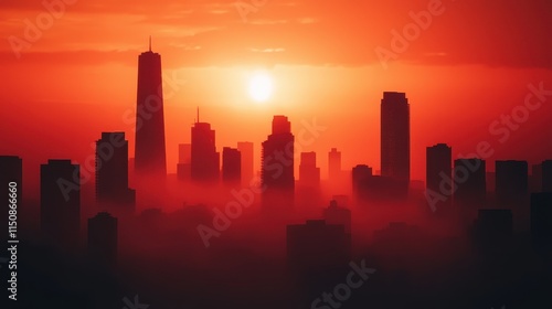 A breathtaking skyline silhouette against a vibrant red sunset, showcasing towering buildings enveloped in soft mist.