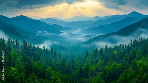 A breathtaking sunrise over mist-covered mountains with lush green forests in the foreground ideal for nature, travel, adventure, or environmental conservation themes,