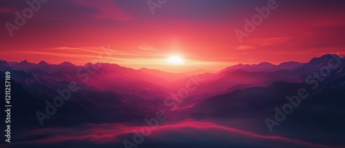 A breathtaking sunset casts vibrant hues over misty mountains, creating a serene and tranquil landscape.