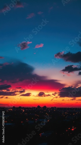 A breathtaking sunset over a city skyline, with vibrant hues of orange, pink, and blue painting the sky, as city lights begin to twinkle in the foreground