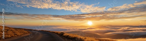 A breathtaking sunset panorama over a winding road, with vibrant colors reflecting in the sky and soft clouds blending into a tranquil landscape.