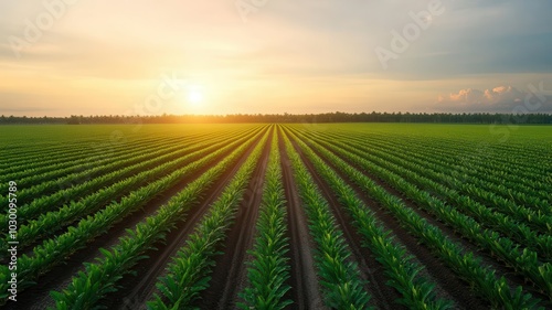 A breathtaking view of a green field at sunrise, showcasing rows of crops under a vibrant sky, symbolizing growth and nature.