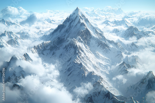 A breathtaking view of a towering mountain range covered in snow, with clouds rolling over the peaks, inspiring a sense of grandeur and amazement.