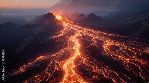 breathtaking, view, volcano, erupting, lava, flowing, ocean, sunset, high-coloured, orange, red, contrasting, deep, blue, purple, hue, sky