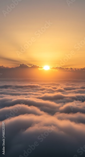 A breathtaking view of the sun rising above a sea of clouds, casting a warm golden glow across the sky and cloudscape.