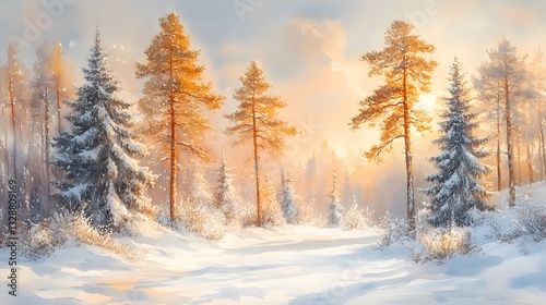 watercolor, painting, snowy, winter, tree, fir, deciduous, snow, branch, serenity, glistening, sunlight, vibrant, delicate, cold, frost, nature, scenery