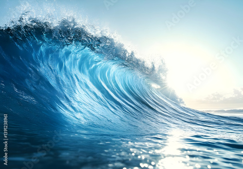 A breathtaking wave crashing against the shore, showcasing the beauty and power of nature under a clear blue sky.