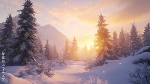A breathtaking winter landscape showcasing snow-covered trees and mountains under a vibrant sunset, evoking a sense of peace and tranquility.