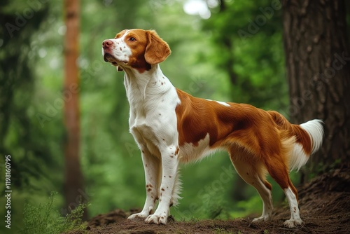 A Breton Epanyol hunting dog stands alert in a lush forest setting ready for bird hunting Trophy