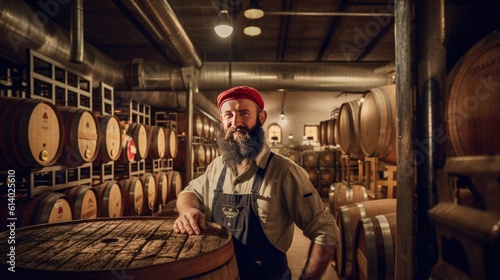 A brewer working and inspects oak barrels for fermentation in the brewery. generative ai