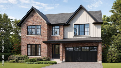 A brick and vinyl two-story home with black trim under a clear sky day.