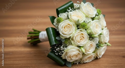 A bridal bouquet of cream-colored roses, accented with greenery and small white flowers, rests on a light brown wooden surface