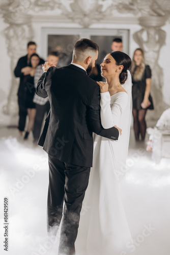 A bride and groom are dancing in a room with a crowd of people watching. The bride is wearing a white dress and the groom is wearing a black suit. The atmosphere is lively and celebratory