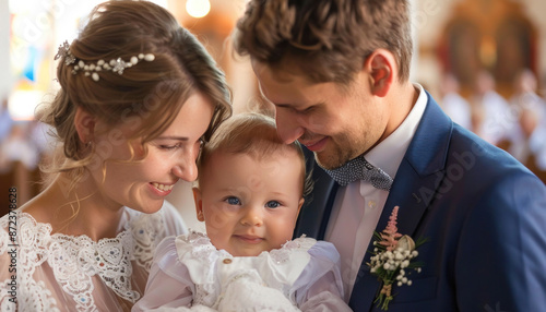A bride and groom are happily holding a baby inside a church during a joyous occasion