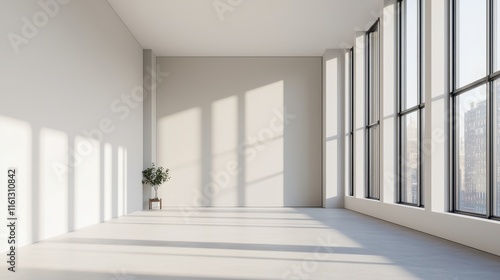 A bright, airy room with large windows, minimalist design, and soft shadows cast on a light floor, featuring a small plant for a touch of greenery.