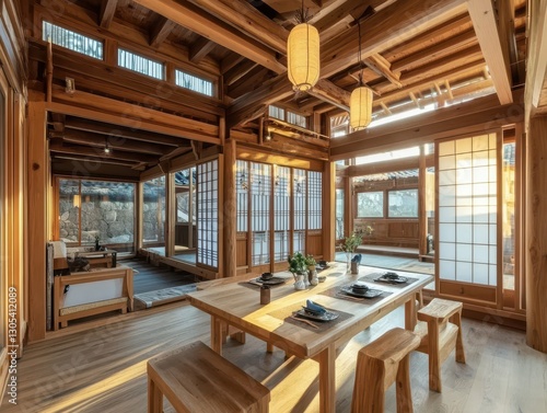 wood, wooden, interior, room, dining, table, chair, bench, lantern, light, ceiling, beam, frame, window, door, panel, sliding, paper, rice, design, architecture, structure, style, view, open, space, natural, texture, grain, shadow, traditional, japanese, asian, minimal, minimalist, decor, meal, plate, dish, setting, peaceful, serene, calm, elegant, sunny, clean