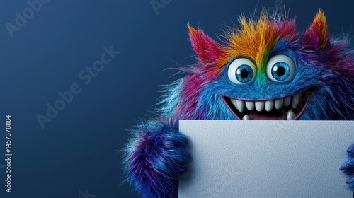 A bright and cheerful furry creature with multicolored fur showcases its playful nature while holding a blank sign against a deep blue background, inviting curiosity