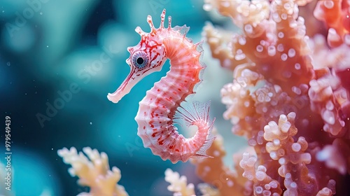 A bright and cheerful seahorse clinging to a piece of coral, its delicate features and unique shape clearly visible.