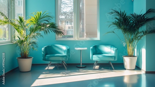 waiting, room, modern, teal, chair, potted, plant, natural, light, bright, contemporary, window, calm, welcoming, fresh, serene, relaxed, comfort, peaceful, tranquil, sunlit, professional, clean, relaxation, friendly, space, indoor, interior, minimalist, decor, stylish, furniture, daylight, greenery, lounge, architecture, public, area, ambience, ai, generated