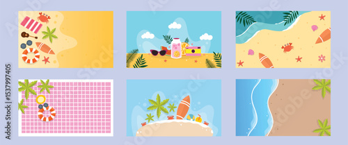 A bright and vibrant summer background set with pool tiles beaches surfboards and tropical palm themed designs