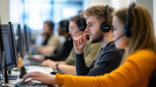 call center, office, tied-up, bright, young, man, front, gesture, screen, helping, colleague, row, employee, assistance, teamwork, technology, communication, collaboration, computer, solution, multitask, workplace, professional, customer service, colleague, supervisor, guidance, training, productivity, efficiency, support, telecom