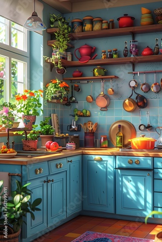 A bright, colorful kitchen filled with plants, cookware, and natural light, ideal for cooking and gathering.