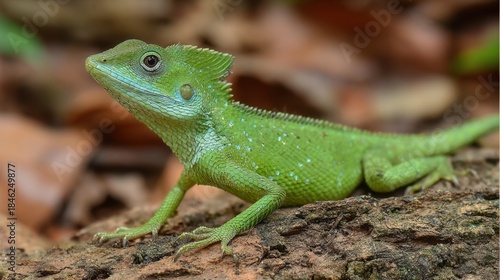 A bright green lizard rests on a mossy log surrounded by fallen leaves in a vibrant forest.