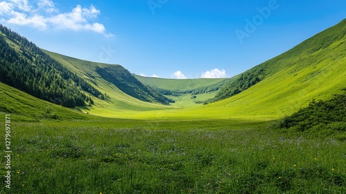 A bright green valley with scattered wildflowers under a clear blue sky, spacious for copy.