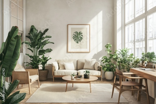 A bright interior featuring plants and comfortable living room furniture