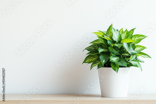 A bright minimalist workspace with a single green plant, a light wooden desk, and a white background