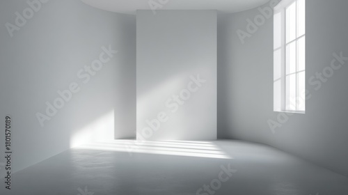 A bright, minimalistic interior space featuring white walls and a window allowing natural light to illuminate the room.