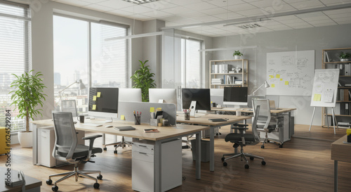 office, desk, chair, computer, monitor, screen, keyboard, mouse, table, window, plant, whiteboard, shelf, cabinet, light, lamp, floor, ceiling, wall, paper, note, pen, crayons, holder, bin, stool, easel, marker, document, folder, book, pot, filing, furniture, modern, contemporary, open, plan, space, interior, design, professional, corporate, business, workplace, workspace, empty, vacant, unoccupied