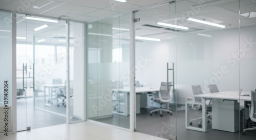 A bright office space with glass walls and white furniture in a modern and minimalist design style