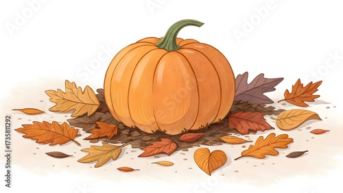 pumpkin, autumn, fall, leaf, orange, harvest, seasonal, vegetable, decoration, squash, foliage, maple, illustration, graphic, white background, thanksgiving, halloween, nature, organic, vibrant, fresh, still life, produce, food, rustic, crop, drawing, colourful