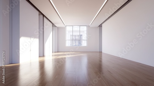 A bright, spacious room with wooden flooring, large windows, and minimalistic design, creating an inviting and modern atmosphere.