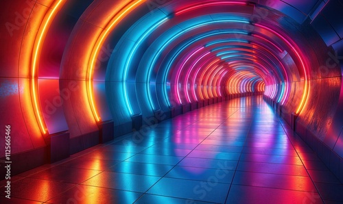 A bright tunnel illuminated by colorful neon lights, creating a dynamic and energetic atmosphere.