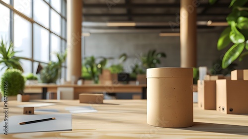 A bright workspace featuring a table with a plant in the background showcasing upcycled packaging materials for an eco-friendly touch