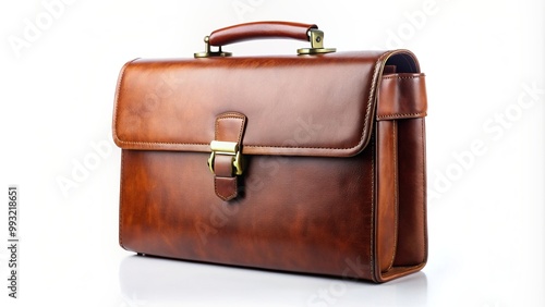 A brown classic briefcase made of genuine leather is featured on a white background in a wide angle shot, fashion,brown, fashionable, professional, luxury, sophisticated, professional