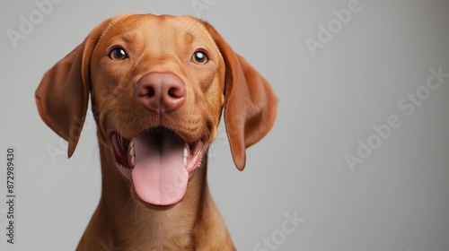 A brown dog with a tongue sticking out and a smile on its face. The dog is looking directly at the camera