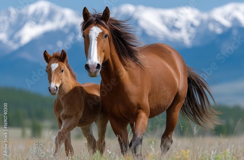 a brown horse and its foal galloping across the grassland, with beautiful scenery in front of them