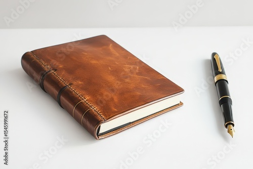 A brown leather-bound notebook beside a gold-nibbed pen.