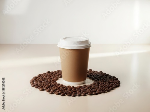 hot drink, cup, bean, brown, paper, lid, table, food, drink, beverage, breakfast, morning, energy, aroma, favor, roast, dark, light, soft, plain, circle, surround, sit, hot, fresh, daily, routine, caffeine, promoting, start, day, beginning, roasted, fragrant, tasty, serve, disposable, ecological, environmentally friendly, simple, still life, product, photo, studio