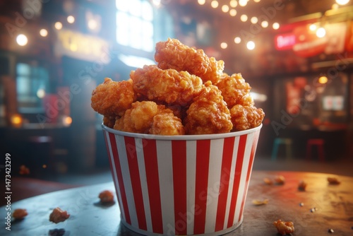 chicken, popcorn, bucket, food, crispy, fried, eatery, table, indoor, stripes, red, white, delicious, meal, snack, fast food, take-out, dinner, lunch, cookery, closeup, epicure, appetising, background, blur, light, tavern, pub, dish, fresh