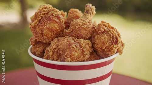 A bucket filled with crispy, golden fried chicken, each piece crunchy and mouthwatering. Perfect for ads. Top view.